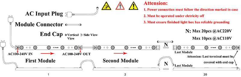 | Connection in series | Max 20pcs @220V, 10pcs @110V | ||